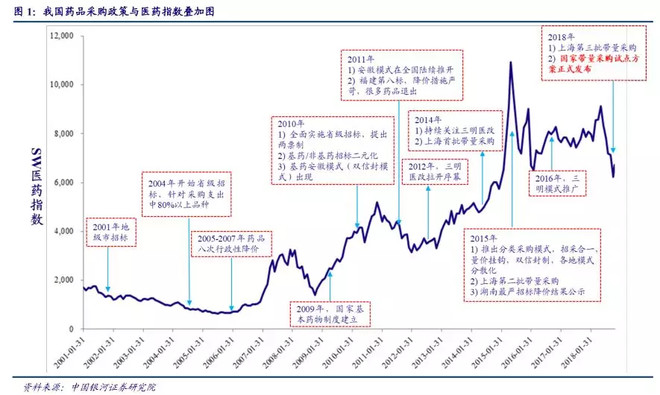 不过,从下图看,采购政策的变化趋势,与医药指数的长期走势情况并没有明显的一致性和关联性。